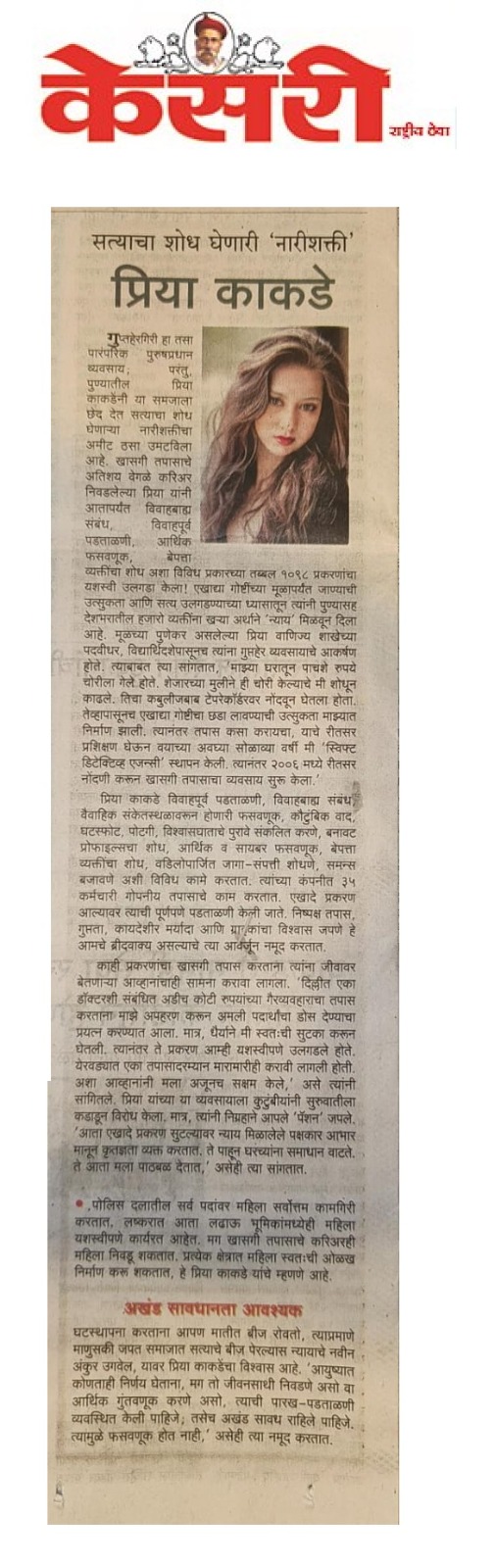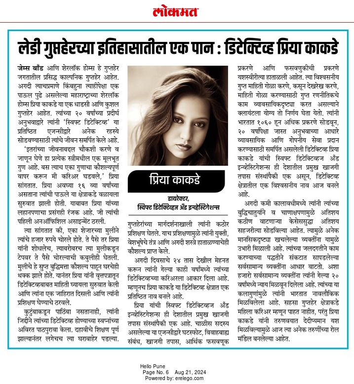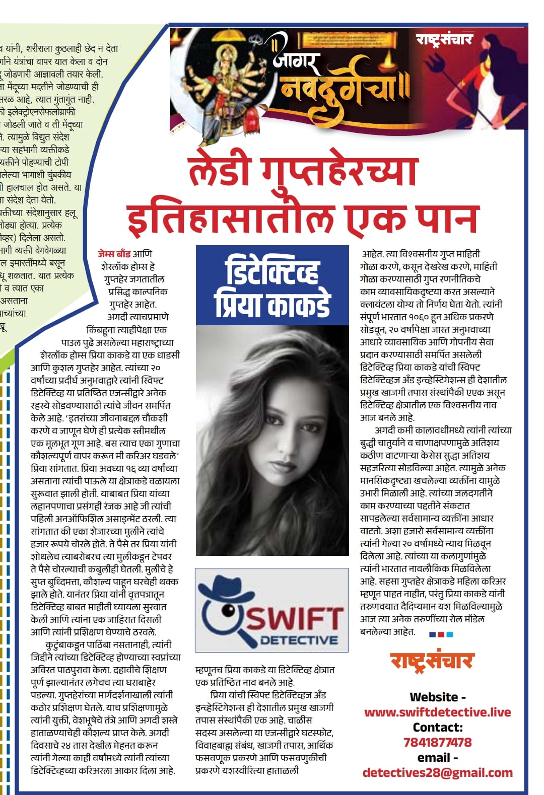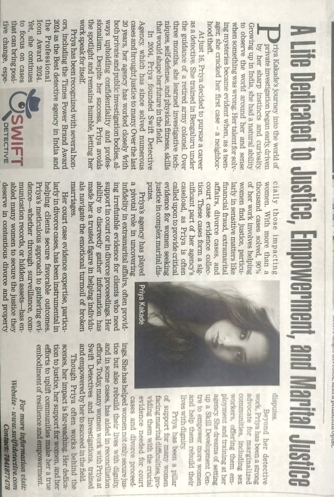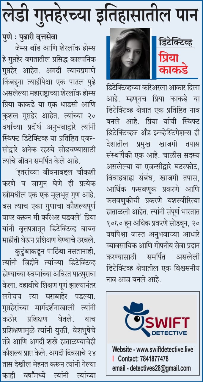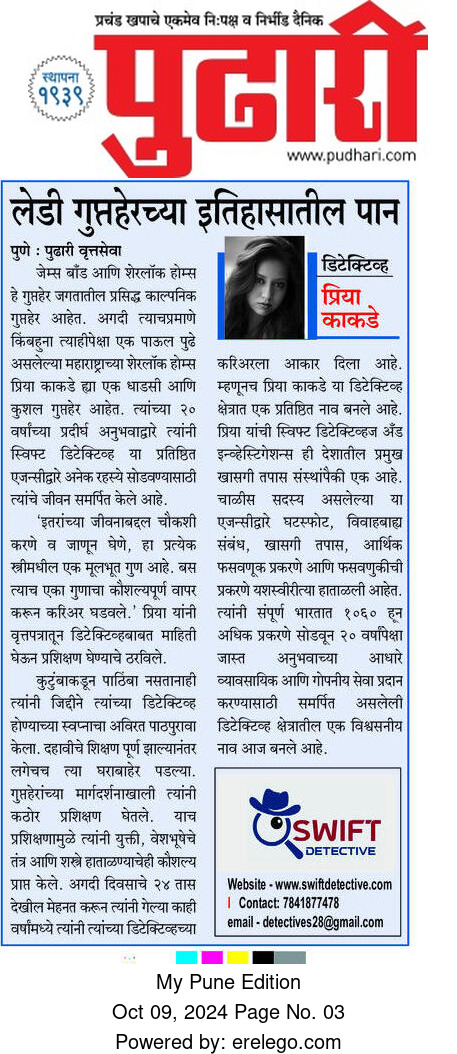 Welcome to Swift Detective Investigator, your trusted partner in the world of private investigations. Based in the bustling city of Pune, we extend our unwavering commitment to providing professional investigative services. With a team of dedicated and experienced professionals, we are dedicated to uncovering the truth and delivering unparalleled results for our clients.